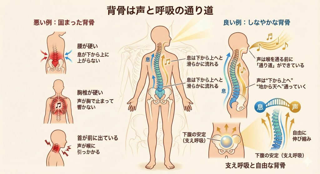 背骨がしなやかであれば、呼吸と声が自然に流れる。